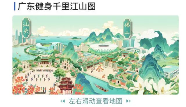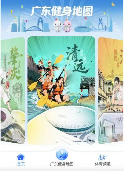 在“广东健身地图”首页,用户可以通过以走马灯形式轮播的广东21城体育性格海报,以及近期大火的广东体育“千里江山图”便捷直达当地体育场馆列表。与此同时,页面上还集成了广东21城体育性格的全媒体报道,将体育性格与体育场馆进行融合展示。依托制作方南方日报、南方+的媒体资源,“广东健身地图”还将提供新鲜丰富的体育日常资讯。