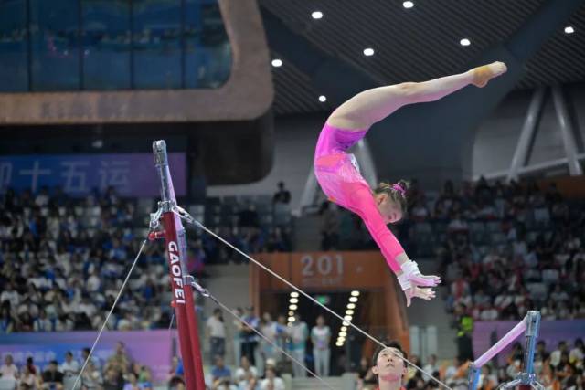 9月10日,柯沁沁夺得十五运会体操女子青年组个人全能金牌、高低杠平衡木跳马全能金牌。图/肇庆市融媒体中心