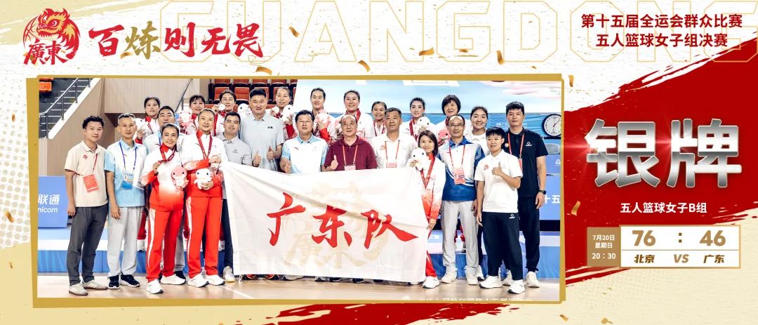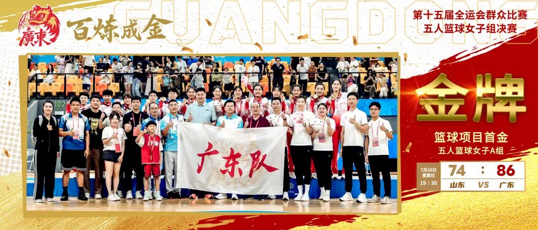 7月20日晚,第十五届全国运动会群众比赛五人篮球女子组决赛打响。广东两支队伍充分展现了精湛的竞技水平和良好的精神风貌,在A组、B组的比赛中分别摘得金牌、银牌。