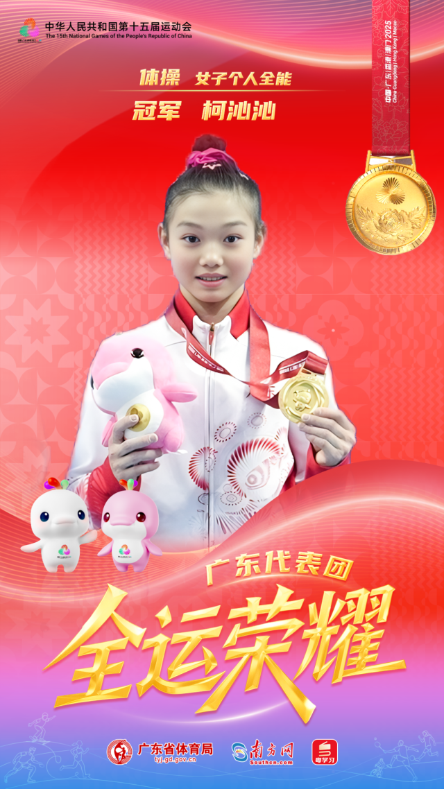 这不仅是柯沁沁个人在十五运会女子个人全能的“双料冠军”(青年组和成年组),还是广东体操队成年组首枚金牌。