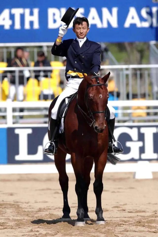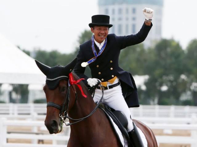 2021年9月18日,顾兵在第十四届全国运动会马术盛装舞步个人赛后庆祝夺冠。图/新华社