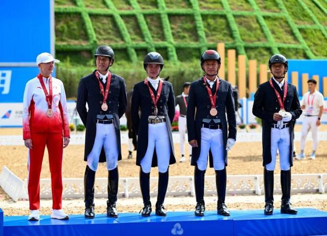11月10日,季军广东队选手黄焯钦(右一)、顾兵(右二)和队友及教练在十五届全国运动会马术盛装舞步团体颁奖仪式上。图/新华社