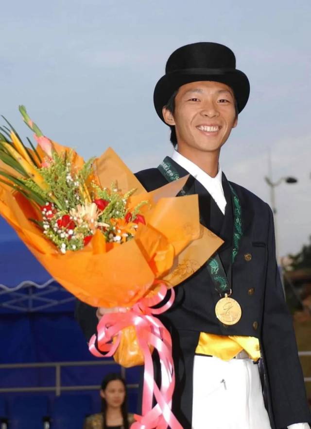 2001年11月6日,黄焯钦在第九届全国运动会马术盛装舞步个人赛颁奖仪式上。图/新华社