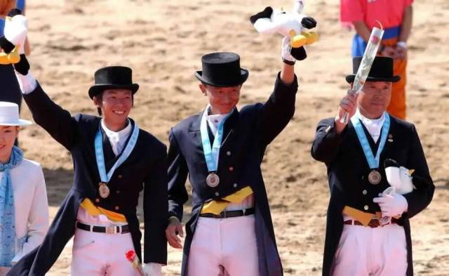 2002年10月8日,中国队选手黄焯钦、顾兵、张立军(从左至右)在颁奖仪式上。在当日进行的第14届亚运会马术盛装舞步团体赛中,中国队获得铜牌,实现了该项目在国际大赛上的历史性突破。图/新华社