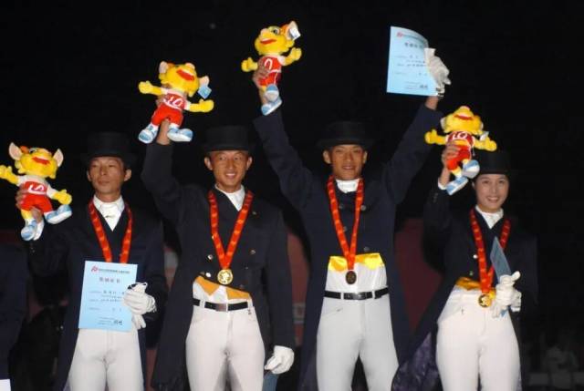 2010年11月14日,中国队马术选手在颁奖仪式上。当日,在第16届亚运会马术盛装舞步团体比赛中,中国队获得亚军。图/新华社