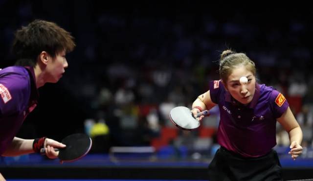 2005年10月15日,广东队选手马琳/刘诗雯(左)在第十届全国运动会乒乓球混双比赛中。图/新华社